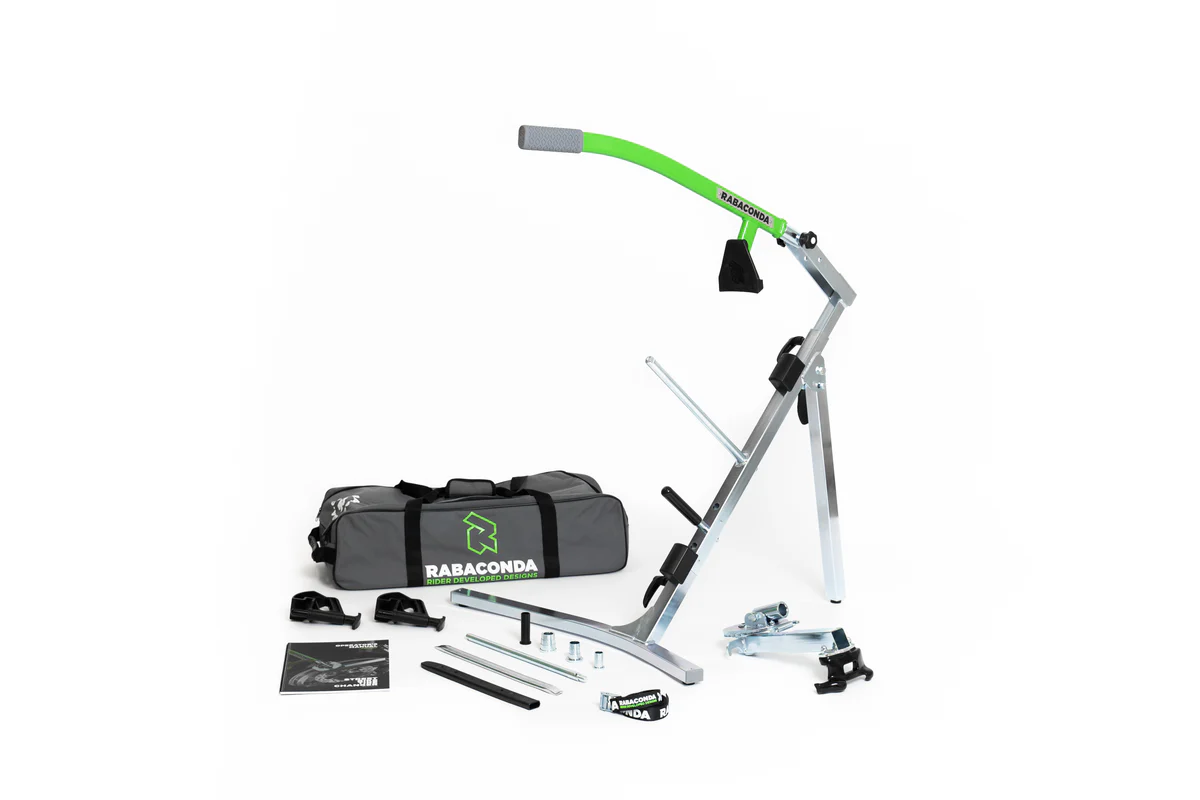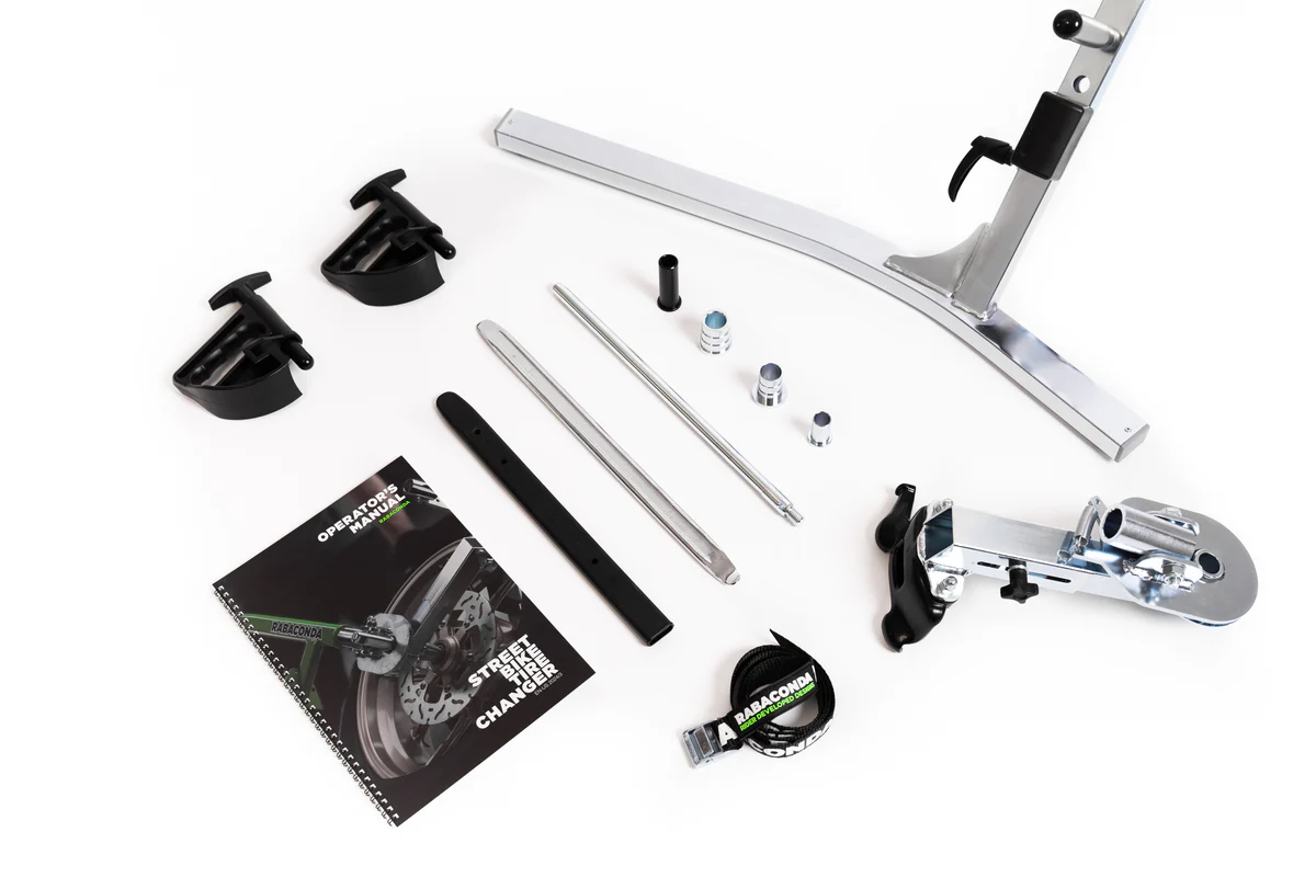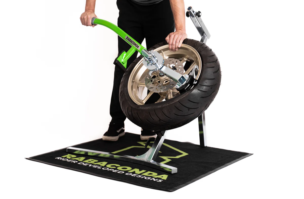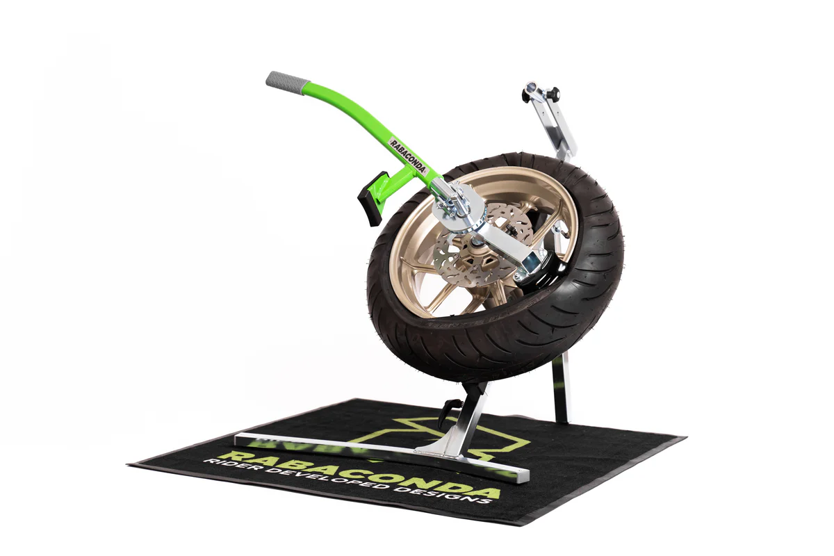 The Rabaconda Street Bike Tire Changer is aimed specifically at cast wheels offering extra rim protection, but also works on wire-spoked wheels. It’s adaptable to wheel sizes between 12-21″, has great ergonomics at low weight, and is perfect for both single and double-sided swingarms. With Rabaconda, you can swap out your own tires in no time whether you’re riding street or hitting the track.